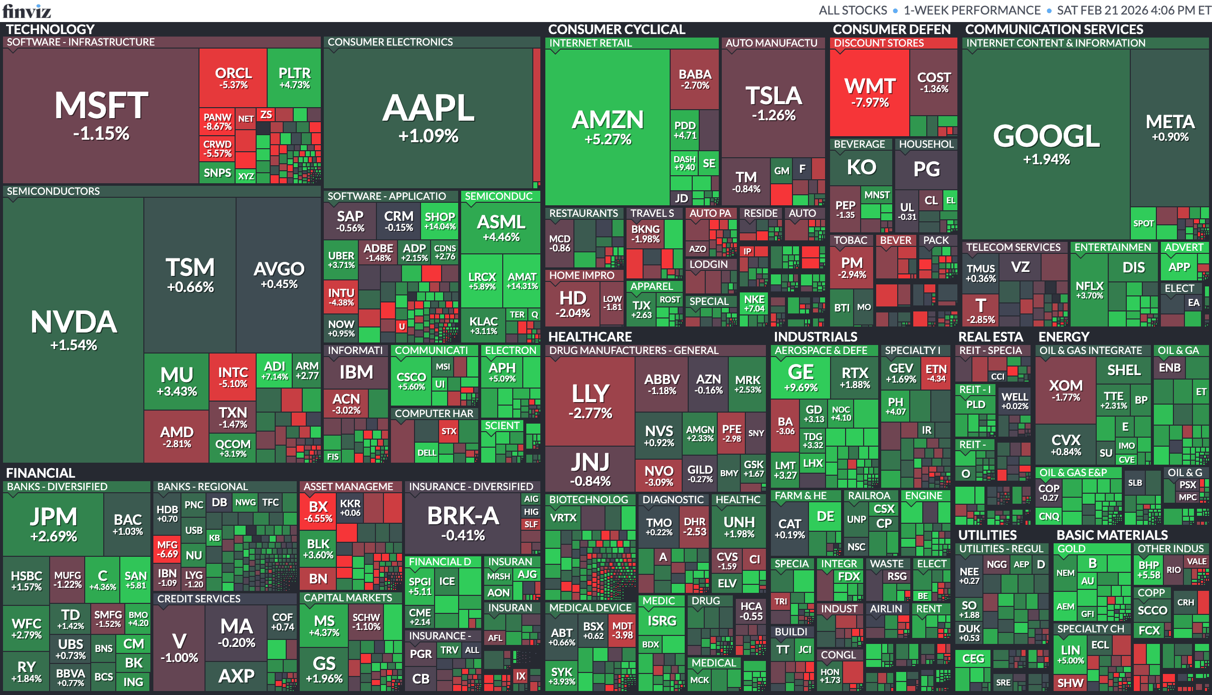 This week’s heatmap shows a clearer shift back into selective growth, particularly within large-cap tech and internet names. Nvidia, Amazon, and Google all posted gains, helping lift the broader Nasdaq, while Apple and Microsoft were more muted. Semiconductors were mixed but constructive overall, with strength in select chip names offsetting weakness in others. Communication services leaned positive, led by Google, while Meta saw more modest movement.