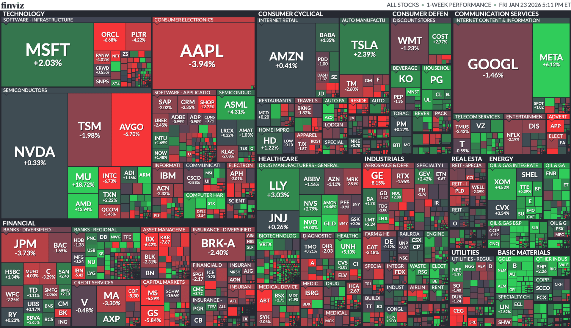 Within technology, semiconductors underperformed as a group, while software and platform-oriented companies held up better. The heatmap highlights clear dispersion: several large hardware and chip names declined meaningfully alongside a notable pullback in Apple. Rather than a clean sector rotation driven by one macro factor, this reflects stock-level differentiation, with investors reacting quickly to earnings outlooks, guidance, and positioning.