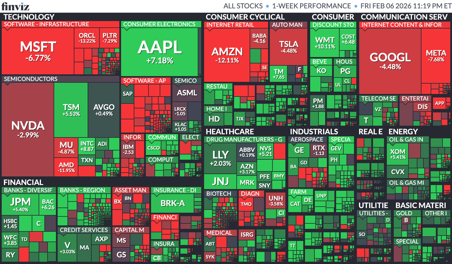 Elsewhere, Energy rebounded, supported by higher oil prices, while Healthcare was mixed but relatively resilient, with large pharma names holding steady despite broader market volatility. Industrials showed selective strength, reinforcing the theme that capital is rotating toward cyclicals with tangible earnings and away from high-multiple growth. Overall, the heatmap reflects a market that is still reallocating risk, favoring defensives and value while continuing to punish crowded growth trades.