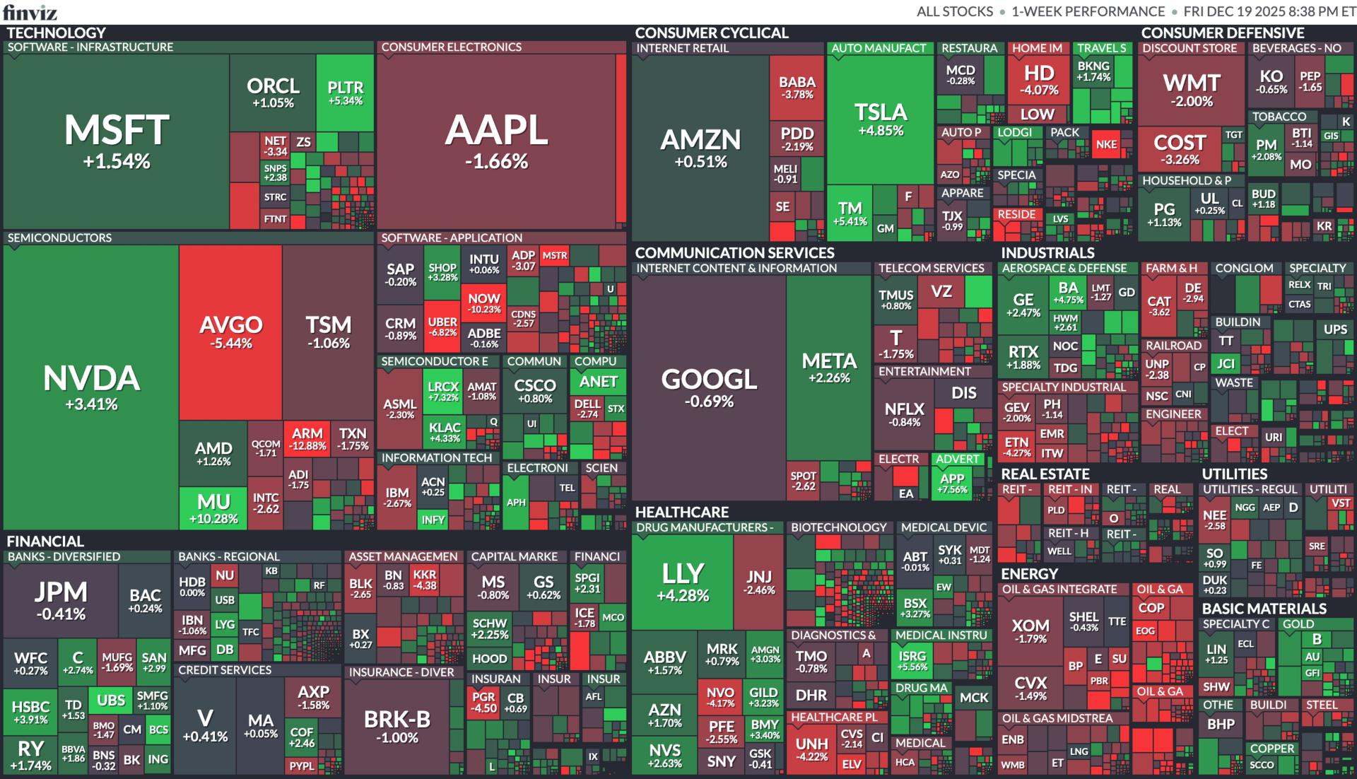 Markets ended the week largely flat with a defensive tilt, as investors digested recent macro signals and headed into year-end with caution. The S&P 500 slipped 0.1%, while the Dow fell nearly 1%, reflecting weakness in cyclicals and industrials. The Nasdaq edged higher (+0.3%), supported by selective strength in large-cap tech, though gains were modest.