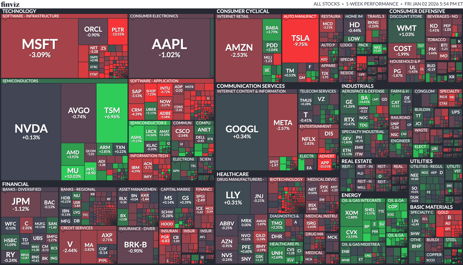This week felt less like panic and more like early year rebalancing, with investors trimming crowded mega cap positions and reallocating selectively. The weakness in large cap tech and consumer cyclicals, alongside resilience in semiconductors like TSM and ASML, reinforces the idea that money is rotating within themes rather than exiting the market altogether.