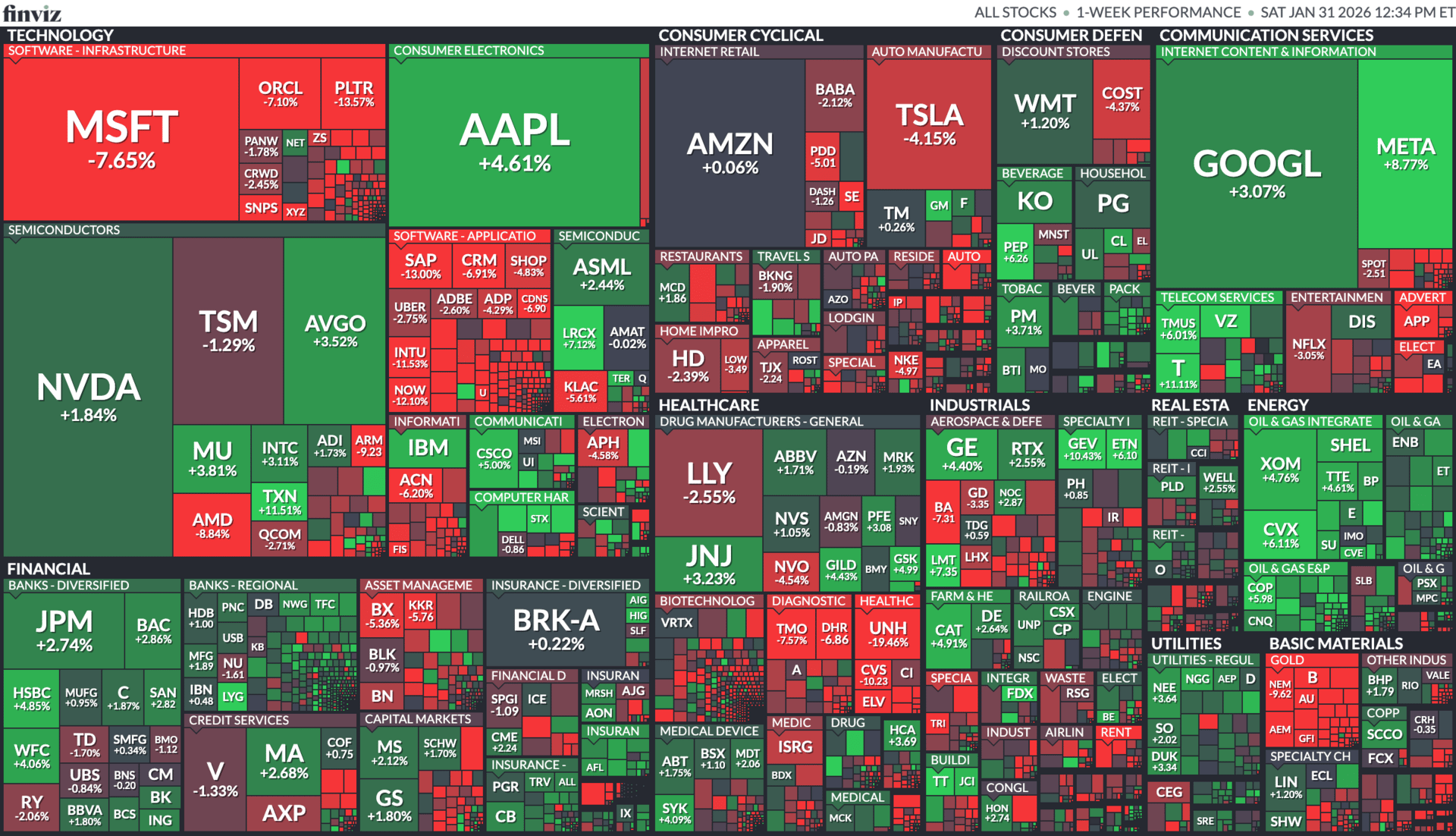 Outside of technology, financials and capital markets names were generally positive, with banks like JPMorgan and Bank of America climbing as traders priced higher yields and the evolving Fed leadership narrative. Consumer sectors were also mixed: Apple and Tesla lagged despite solid early demand signals, while select retail and telecom names held up. In industrials and materials, energy and basic materials stocks tended to outperform, suggesting rotation into commodity-linked sectors as gold and silver volatility pressured precious metal miners. Overall, the heatmap shows a market digesting earnings and macro shifts rather than one moving in lockstep — a clear reminder that sector leadership is increasingly stock-specific in this environment.